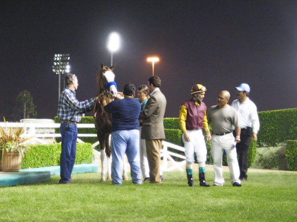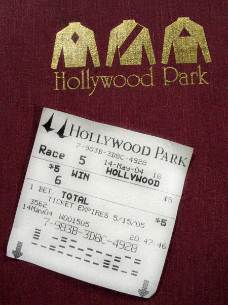Friday night at Hollywood Park was Sony day at the races and I finally got to prove good ol’ Monica wrong. See the previous horse racing post [LINK]. I bet “$5 to win” and actually won for once. A group of us were invited down to watch the the #5 “Sony” race from the fence and go to the winners circle. It was a $50k purse and I put my money on #6. Winner! My first and last bet of the night. I love to win, it just never happens so I’m gloating. How much did I win? 5 bucks. I didn’t know the horse had 1-1 odds, I just liked the name. That about covered the cost of parking and gas. And the winner is… me.