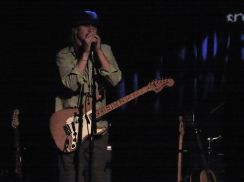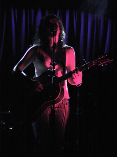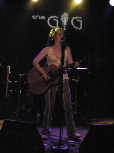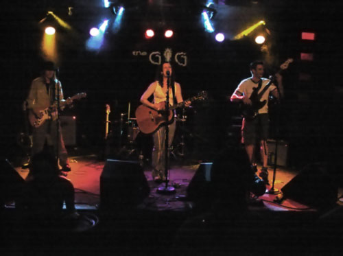 Alana Gentry [LINK] and “friends” at “The Gig”. Sandro [LINK] emailed me this flyer of a friend of his that was playing at “The Gig” Saturday night. He thought I’d be interested. Well yeah, a girl with a guitar, count me in. Try finding parking around Melrose on a Saturday night though. I almost drove half way back home before I found a spot. Of course I always do my homework on someone before going to a show. Where they play, do they have any recordings? You know, curiosity stuff. Musicians who wear hats on stage always seem much more serious. Like it’s a sign to leave them alone because they’re concentrating. Just an observation. Elton John wore some pretty silly hats though so maybe my theory isn’t quite refined enough. If you take enough photos at a show, you inevitably get an armpit shot. There’s always somebodys head in the way too. “the GIG” logo sticking out her head looks like a hairy condom. Drummers really get screwed on the whole visibilty thing. Except that “Night Ranger” dude who sits on the side and sideways like here. [LINK] Alana introduced her Grandfather who was out in the audience. I have to give her credit because it’s kinda hard dance around the stage all sexy and shit when your family is hanging out at your show. There are photos of me on that other camera. I do exist. Go visit his site sometime. [LINK] That photo might actually show up. Alana came out after the show and acted very vampiric. I do know the girl on far right in the background was v e r y friendly. That would be Emily. Oh Emily. Then there was the blonde. I left MY Kangol cap in the car. The next band was threatening to come on so we left. Tah dah.
