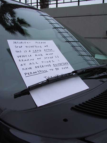 More behind the scenes of the entertainment world. This note just had to be on a BMW SUV too… Apparantly you got to pull the ‘tude to show ’em who’s boss. Let’s see, stage 25 is the set of “The King of Queens”, it’s a lead actor…? So Alex, what’s your prediction for the big summer hit? Your movie?! That’s terribly humble of you. It’s opening 3 May according to the dyslexic art department.
