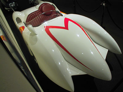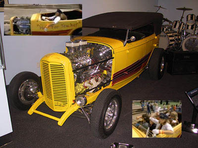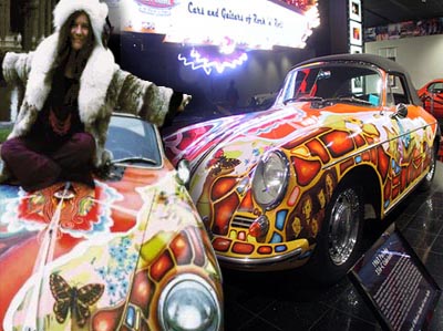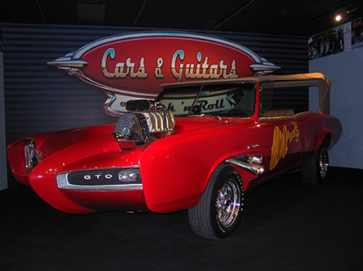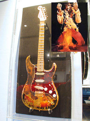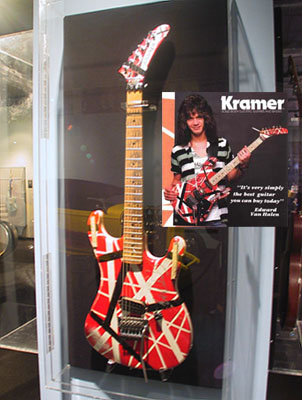 It’s only across the street, yet it took me nearly 6 months to go to Peterson Automotive Museum to see the “Cars and Guitars” exhibit. It was also the last day it was open. Me and my best friend Procrastination went. Herbie “THE” Lovebug was there. Van Halen’s “Hot For Teacher car was there. I was hot for teacher once. Tina Geller, health class, sophomore year, she was 24, I was 15. Meow. The “Hey, hey we’re The Monkees…” was on display. I just now realized The Monkees, changed the spelling of their name from monkey. Kinda like The Beatles, aren’t The Beetles. Um, duh. Only took me like 35 years to figure that one out. The Joplin Porsche was also there. I love Janis. I love that Porsche. I’d be into buying this if my Shrek bonus had been a wee bit bigger. Ok, a lot bigger. Oh, and the friggin’ Mach 5! Nice. I loved “The Great Race” car and the movie was one of my favorites as a kid. I saw it recently and realized it’s about two hours too long and kinda silly. Never revisit films that you absolutely “loved” as a kid. You did have the mind of an adolescent, so inevitably you find yourself asking “…what did I see in this movie?” I’ve started to believe that I might have been a dumb kid. The Batmobile looks like crap in person. It’s all plasticy looking. Not menacing. Thumbs down. The Hendrix guitar was there. The Hendrix “I’m going to torch my Strat on stage at the Monterey Pop Festival” guitar. Yeah, that guitar. After the show it ended up in Frank Zappa’s hands and is now in the Zappa estate. It has a new left handed head stock to make it look like Hendrix’s, but it can now be played right handed. The melted pickguard was also replaced. Is there a more famous picture of a guitar?? And the just plain silly looking guitar of Van Halen. Could it be any more 80’s looking. Stick a Nagel painting behind it and you’ve got something. In the ad Eddie even has a cigarette stuck in the neck of guitar. “Hey kids, be just like me! Be a rockstar, play Kramer guitars, and smoke. Only, now that I’m dying of cancer, that might not be such a good idea.” It can be seen in the “Panama” video. Not the one in the ad, the one in the case is in the video.