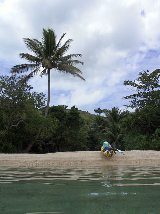 This morning we set out in the kayaks. The coastline was spectacular with many beautiful sand beaches, green and blue bays, and picture perfect palm trees. That’s my kayak the “Screaming Yellow Zonker” at our midday stop about a quarter of the way around Ono. For lunch we had carbs. Carb salad, carbs on ice, fresh cut carbs, liquid carbs, and carbs in the shape of Pringles. Tonight we’re staying in the village of Naqara. I think we’re all excited yet anxious about what’s going to go on there. Lot’s of customs to follow. George was voted our “Ratu”, or Chief, as he’s the oldest and will represent us at the ceremonies.