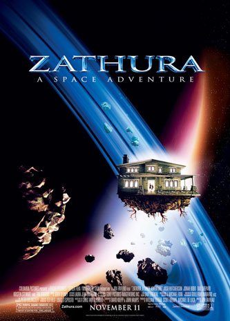 Zathura, out on DVD Tuesday. And the DVD poster is soooo much better than the theatrical poster. It only made 28 mil. at the box office. At about 9 bucks a ticket these days that was about 3 million people that went to see a movie about a house in outer space. Not so good. Now… judging by the posters above which movie would you have wanted to see? The one with the cool retro robot with a buzzsaw, an astronaut, some rocketships, a lizard creature, AND a cute girl? Or the one with the giant house flying around? I mean, come on, how do you market a house to kids? Oh well. The movie’s cool though, especially if it had come out somewhere between The Dark Crystal, Weird Science, Gremlins, The Rocketeer, Young Sherlock Holmes, E.T. or The Goonies. But no, it came out about 20 years later. It was fun to work on even as a dud in the box office but it will do well on DVD.