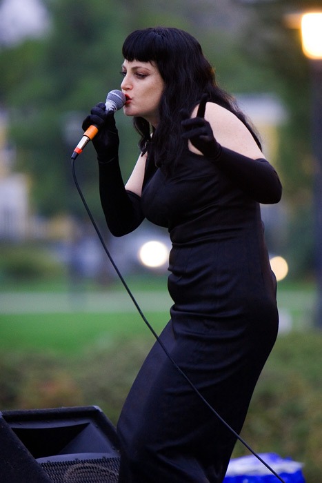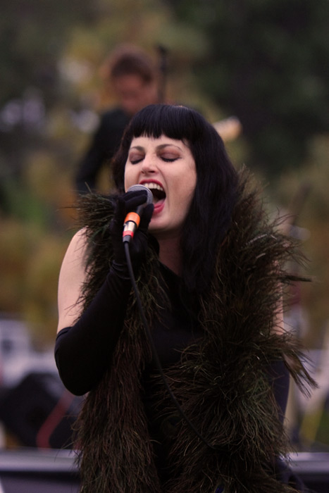 I headed over, all 200 yeards away, and she comes out and holy crap she’s freakin’ great! Daylight and all. Considering there were only like 15 people there she still put on a show. I would have crumbled in that position. Yikes, ballsy. So I have this total soft spot in my heart for burlesque type girls and was crushing on her the whole show. She did about 30 minutes and her songs were great. She’s hella photogenic too. I spoke to her briefly after the show and asked her about any upcoming stuff and she gave me her card which states… “Musician Extraordinaire Lifestyle Consultant”. Indeed. This HAD to be one of her strangest gigs.