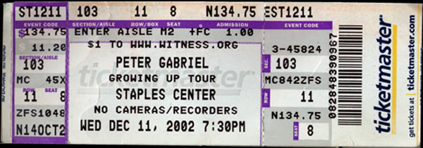 Peter Gabriel at the Staples Center. 16 years between shows is way to long. Last time was at the L.A. Forum in 1986 on the “So” tour. During “Growing Up” a Zorb [LINK] was lowered to the ground, Peter was underground and came up underneath it and into its center. Then he wheeled it out on the circular stage and ran around the stage while singing. He didn’t have any water in his Zorb, and I didn’t have 15,000 people cheering me on [LINK]. No one in this band has any hair left. Setlist for tonight: Here Comes The Flood – Darkness – Red Rain – Secret World – Shock The Monkey – Sky Blue – Downside Up – The Barry Williams Show – More Than This – Mercy Street – Digging In The Dirt – Growing Up – Animal Nation – Solsbury Hill – Sledgehammer – Signal To Noise. Encores 1: In Your Eyes. Encore 2: Family Snapshot – Father Son. Saw Brooke Shields too. Speaking of which, I saw Tommy Lee this week and the little dancing midget guy from “Twin Peaks”.