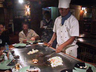 After a long night of sleep without mozzies buzzing about, we settled in slowly at the Shangri-La Resort. We finally got a tropical sunset over the water. Somesthing we never got while out kayaking. That night we drove back into Nadi to meet up with Tony, or kayaking guide, for dinner and then hang out with the next kayaking group. Another group from Weta was arriving later that night. There is 14 of them, but I’m glad our group was only eight as it was probably a much more personal experience. Smartly no one drank the water at dinner tonight. The previous night everybody who drank the water at the restaurant felt sick. You try once, but learn quick. Obviously this is some sorta Beni-Hana we’re eating at.