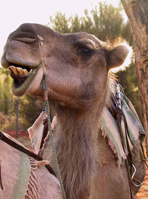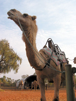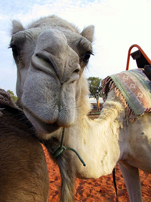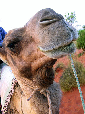 If I have to drag my ass out of bed before the sun rises it better be good. Riding a camel falls under that category. 4:45am to hop on a smelly animal and look at a sun that comes up everyday…? Where do I pay? Ok, so it was really fun and really beautiful. There’s like 200,000 wild camels in Australia or something. Not that we were riding wild camels, but who’d of thought? Uluru, although not brighly lit up, was silouettey. After the ride we grabbed a few camel portraits.