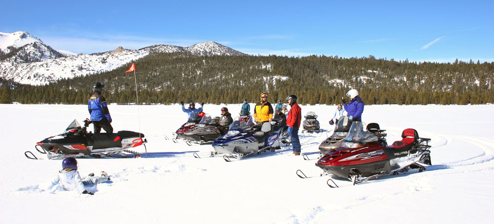 Another trip up to Mammoth for the Imageworks ski trip. After last years solo snowmobiling trip I was able to gather 5 more this year and the trip was outstanding. Visted the caldera and a couple of small craters where we stood on the edge and looked down. It had snowed all week so we had huge drifts and massive amounts of powder to ride in. All the trees were covered in snow and looking very Seussical. Me, Jill, Alberto, Alice, Howie, and Michelle all partook. Below is our group on the caldera. caldera: a volcanic crater that has a diameter many times that of the vent and is formed by collapse of the central part of a volcano or by explosions of extraordinary violence.