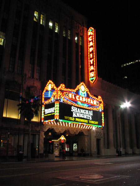 Diane Garrett, “Variety” reporter extroadinaire invited me to the Premiere of “Shanghai Knights” at El Capitan theater. Lot’s of press and lights all over the place. Jackie Chan was doing interviews out on the street. Fans were lined up on Hollywood Blvd. We got to walk down the red carpet. Well at least behind all the stars. The after-party was at the Hollywood and Highland Entertainment center and Owen Wilson was milling about. Crystal Bernard was looking old. Jon Voight was sitting upstairs in the corner, and all I could think of was he was depressed about Angelina. That crazy looking guy from the movie “Ghost” who runs around on the subway system freaking out Patrick Swayze. He was there. Vincent Schiavelli. Yeah, that guy. S.W.A.G. for the night included a press/guest badge, chinese takeout boxes with “Shanghai Knights” printed on them, and a banner of my name in some sorta fancy calligraphy. They hired all those guys from the 3rd Street Promenade to do them for free at the party. Not that I would buy one normally, but it was free. I told Diane it was perfectly OK to invite me to any of these she sees fit. Here’s her writeup [LINK]. Damn, Nia Vardalos was there… missed her.