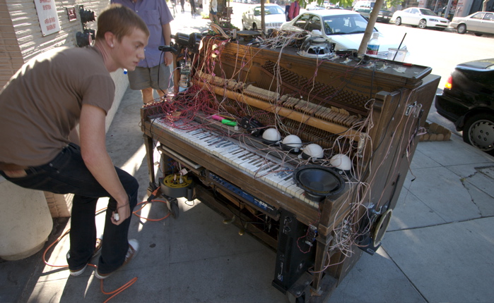 Yeah… just not that into sound artists all that much, but I gave Soundwalk [LINK] a shot. A little too “experimental” for my taste. I guess I was searching for something a little more whimsical. Everyone seems so serious. At one of the gallery stops, some people were writhing around on the floor to ambient music. All serious and stone faced. It would have been much cooler if they had been writhing around and laughing like mental patients or something. But no, this was serious art this writhing. We must writhe stoically to honor the memory of writhers before us who paved the path for our writhing lifestyle. Unfortunately the one thing that intrigued me didn’t seem to be working, the above musical thing. Looked cool though.