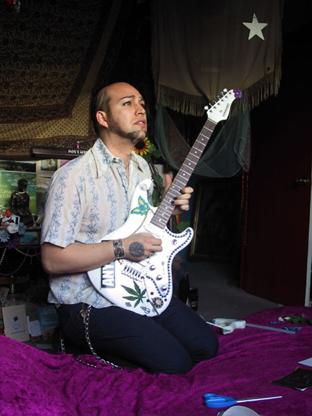 I had my taxes done this morning and then had lunch with my parents and sister after that. Got a load of money back, oh my. The last three months have been very green. After that I called up Riz to see if he was around. He just got back from Anyone’s first tour ’round the States. We talked about his recent visit with Ozzy and the various european festivals they’ll be playing this summer. As we were hanging out he had to decorate his new “Fernandes” guitar. See the problem is… he has an endorsement deal with “Fernandes” guitars. They just got word that he didn’t pose with their guitar during the photoshoot for “Guitar One” magazine. So they called and bitched him out about it and said how disappointed they were. He told them the photographer wanted him to pose with his “decorated” guitar. Eh hem… ok, so he stretched the truth about that a bit. The decorated one happens to be a Fender Strat that he uses live. That’s the part they weren’t too happy about. He likes the Fernandes guitars better, but they aren’t decorated, so he explained to them that he has to be able to decorate the guitars so he can use them live and for photos. So here we have the beginnings of the guitar being decorated. Everytime he added a new decoration he would pick it up and play it to make sure nothing was in the way. This guitar should start showing up in magazines and concerts, probably much to Fernandes’ relief. Forget his guitar playing, he’s a master with a glue gun. Click here [LINK] for the guitar as it used to be. We were talking about the weather a lot for some reason.