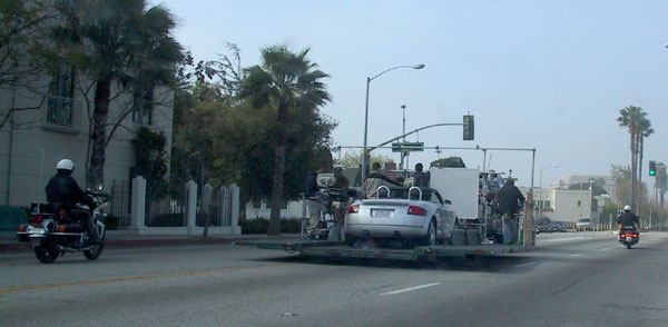 Don’t read this if you’re young and naive and believe movie stars really do stunts and stuff. Living in L.A. can be funny. The magic of movie making. Cruising down the road is Bob the actor in his Audi TT on the back of a camera truck. They just HAD to have this shot I guess. Put some screaching tire sounds in and you’ve got something. That’s Imageworks on the left.
