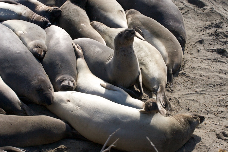 We got up this morning and had some complimentary breakfast in the tea room. Free is frequently good. Much like expensive is frequently bad. Make your own waffles and things. So we set off to go see some seals. Not your ordinary run of the mill lazy harbor seals, hah, we’re talking the seal monsters of seal monsters. So big they went, “hey they’re seals, but they’re like elephants!” Elephant Seals! Brilliant! You don’t see them saying Elephant Mongoose do you? No, no you don’t. They don’t even say Seal Elephants when elephants are having in bath in their watering hole. We first got to what we thought was Piedras Blancas but then noticed Liza’s jacket was missing, so I called back to the hotel and they went and looked for it. While we were waiting for a call back we checked out the seals bobbing their heads in the ocean right of the coast. Frankly I was kinda disappointed there wasn’t more flopped up on the beach. The ones out in the water were making funny snorts and stiff so that was cool.