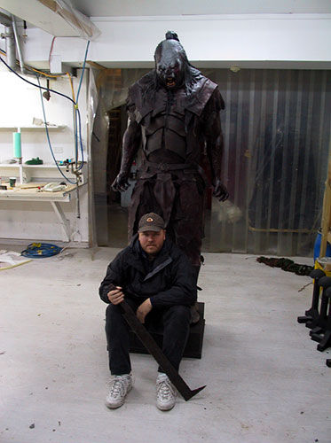 Uh oh, dork alert. Over in the Weta workshop they have all sorts of cool shit. Much more interesting than the digital side of things. Giant statues, set pieces, minatures, etc. As of tommorrow this statue of Lurtz [LINK] is on it’s way to England for the premiere of “The Two Towers” in December. It’ll be at the theater where they hold the premiere. Or so I’m told. It’s really cold over there because it’s just a giant warehouse. Beat your ass with this weapon I will. Oh brother, who told me to hold that? Gino Acevedo invited a few texture painters over and since I shared a room with them I tagged along. The old man and the dog are from the film “The Frighteners” [LINK].