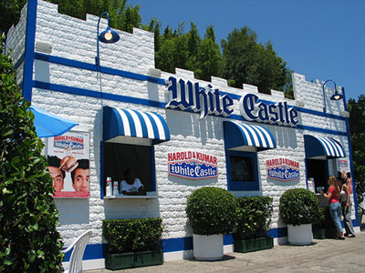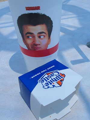 When you live in the land of “In-N-Out” burgers the thought of White Castle coming to town is laughable. To help promote the film “Harold & Kumar Go To White Castle” the White Castle restaurant chain opened up a temporary store on Sunset Blvd. Just to remind myself how bad the burgers are I went for a visit. The burgers were free and so was the entertainment. Turns out they hired a bunch of hula hoop girls to gyrate out front. Not sure what that has to with anything, but I sat there and ate my burger and felt like a creepy old man watching them. A hardcore vegan stopped by and picked up a burger to give to his dog. He started going on to one the booth babes about veganism and how dogs are canines and all sorts of stuff. He even gave her his card and said to call him. Then he rode away on a beat up old bike with bags tied around the handle bars. People are weird. Take a peek at the gyrations…